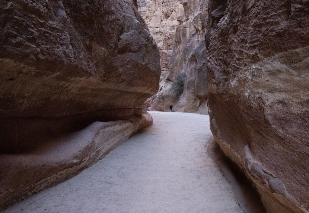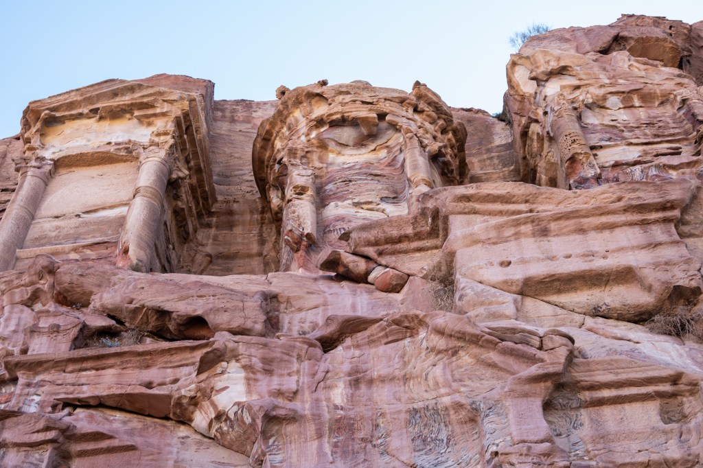 We began our tour by entering the Siq which is a 2km corridor to the Treasury that was carved by tectonic forces – earthquakes, and erosion of stone due to flooding over many thousands of years. The cliff walls are 100 meters tall and the width can narrow to 2 meters and be as wide as 50 meters. Erosion of the soft sandstone walls has revealed a palette of pink, yellow, and blue tones. Some rock walls were a swirl of colour.