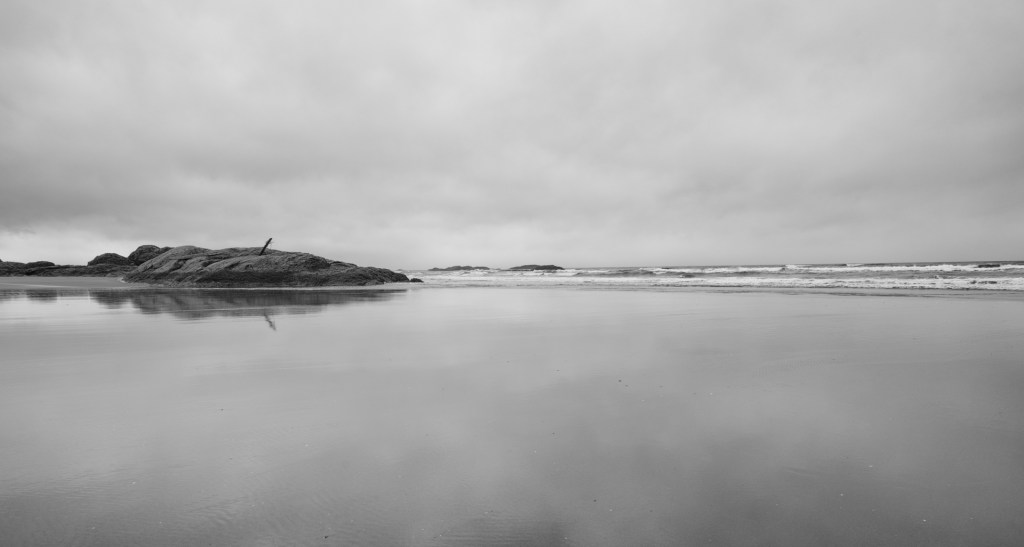 The rain on Long Beach let up for about a half hour. The tide was out and the wind fairly calm. The wet beach mirrored the sky. A short-lived sense of calmness prevailed.