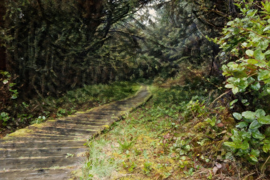 A very soggy wooden path leading back into the rain forest from the beach.