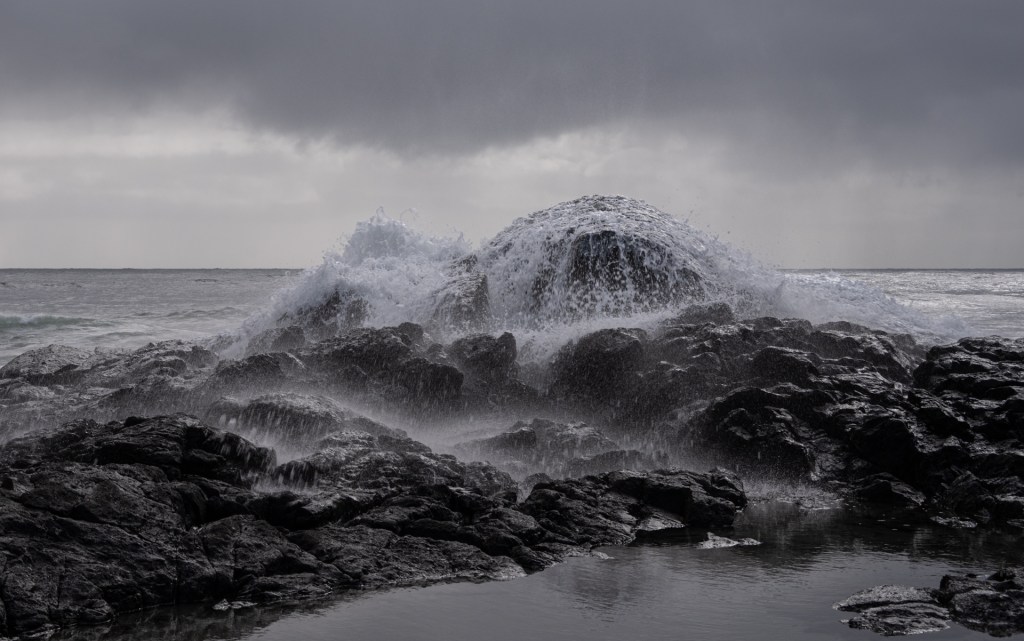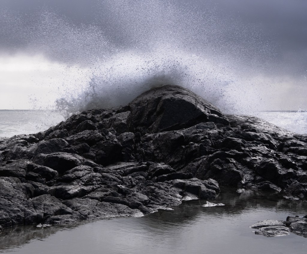 A soft “whoomph” as the wave breaks; followed quickly by an enormous display of water splashing upwards and over the rock wall creating a momentary foamy water fall .